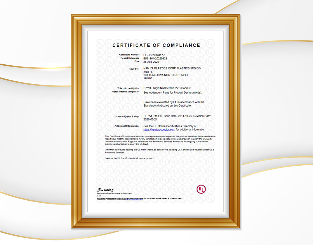 NAN YA PLASTIC PIPES AND INJECTION PRODUCTS PASSED ISO 9001 QUALITY MANAGEMENT SYSTEMS.